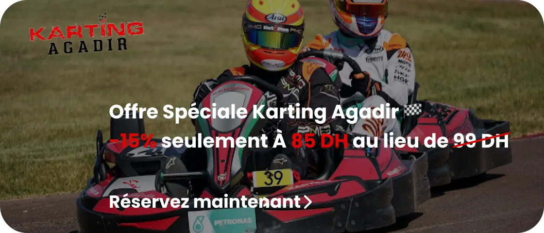 Profitez de l'adrénaline au volant à partir de 85 DH seulement au lieu de 99 DH ! 🚗💨 Bénéficiez d'une réduction exclusive de plus de 15% en réservant sur notre application. Vivez une expérience palpitante au Karting Agadir. Et n'oubliez pas, pour profiter de cette offre exceptionnelle, réservez impérativement depuis notre application ! 📲