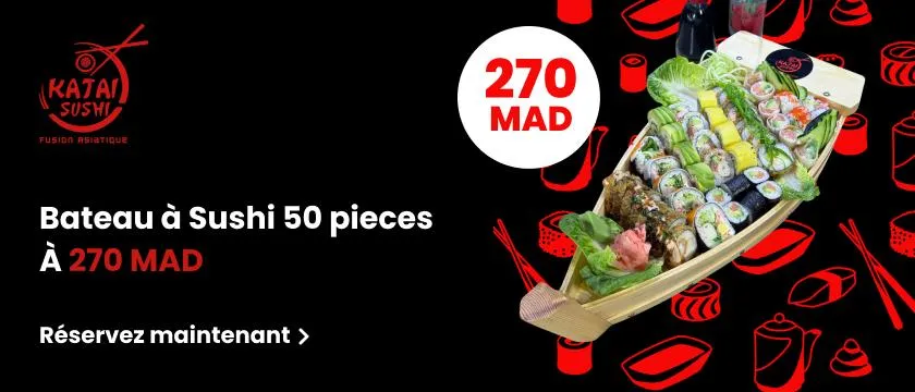 Découvrez un festin de 50 pièces de sushis frais et savoureux chez Katai Sushi, le tout pour seulement 270 DHS. Parfait à partager entre amis ou en famille, venez profiter d'une expérience japonaise authentique et délicieuse !